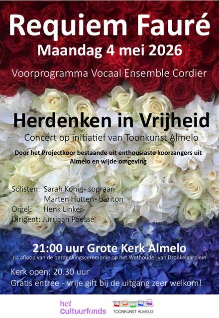 15 apr 2026 ![]() Muzikale afsluiting van Dodenherdenking op 4 mei In een gratis concert zingt projectkoor ‘Herdenken in Vrijheid’ het hemelse Requiem van Gabriel Fauré. Hiermee sluit Almelo het programma van Dodenherdenking op passende wijze af. Het concert vindt plaats in de Grote Kerk om 21 uur, na afloop van de officiële herdenking op het Wethouder Van Dronkelaarplein. De kerk opent om 20:30 uur. Beide evenementen zijn afzonderlijk te bezoeken. Om zoveel mogelijk mensen in de gelegenheid te stellen dit concert bij te wonen, is het met steun van het gemeentelijke Cultuurfonds vrij te bezoeken. Een vrijwillige bijdrage is welkom. Het concert staat onder leiding van dirigent Jurriaan Poesse. Het wordt uitgevoerd door een projectkoor waaraan koorzangers uit Almelo en wijde omgeving deelnemen. Toonkunst Almelo verzorgt de organisatie. Vocaal Ensemble Cordier, een kamerkoor van afgestudeerde conservatoriumstudenten van ArtEZ, zingt vooraf drie liederen over herdenken en vrijheid. Vervolgens sluiten de leden aan bij het projectkoor om het ontroerende requiem van Fauré uit te voeren. De solopartijen worden verzorgd door bariton Marten Hutten, Cordierlid, en sopraan Sarah Konig, die eveneens bij ArtEZ is afgestudeerd. De uitvoering wordt begeleid door Henk Linker op het grote kerkorgel. De foto’s geven een impressie van de uitvoeringen in 2022 en 2024. ![]() Contactgegevens Toonkunst Almelo Hans Admiraal, Tel: 06.4409.4140 E-mail: h.admiraal53@gmail.com Of: secretariaat@toonkunstalmelo.nl Website: www.toonkunstalmelo.nl | ||